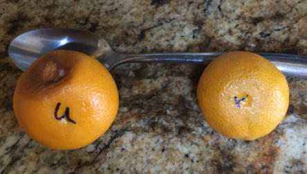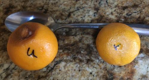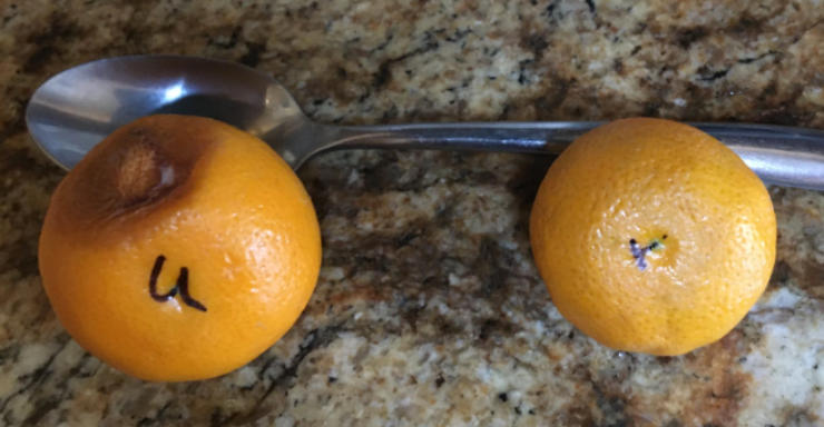 I took two small tangerines and exposed one to the ISEE vitality and one was un-exposed (see the U on one and the V on the other) and put them in a closet not next to each other! The photo shows one that was unexposed (U) started to rot in 4 days, while the one that was exposed (V) it still perfectly fine!!!